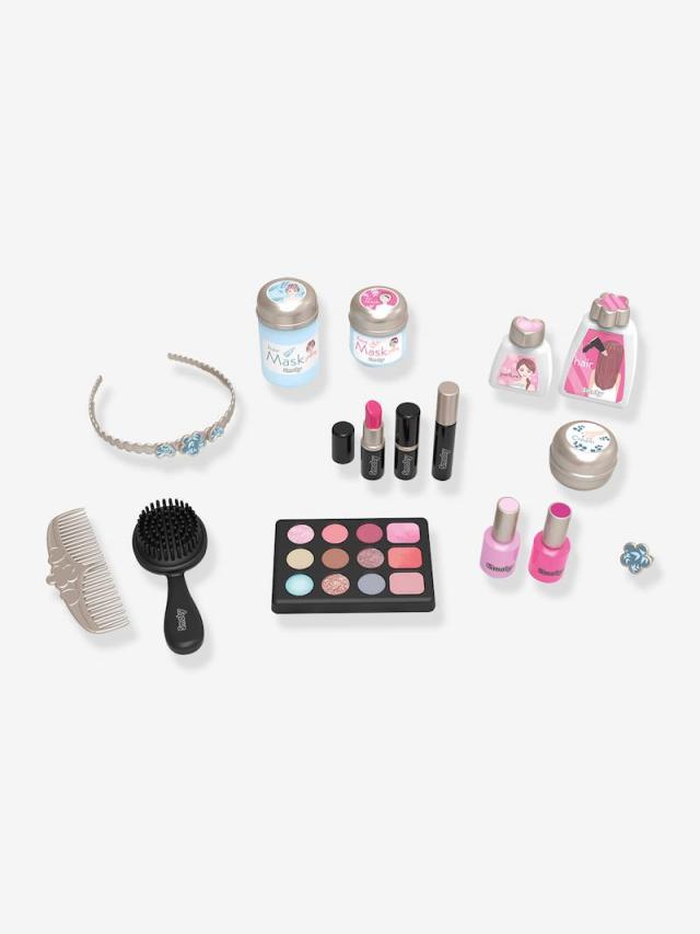 My Beauty – Peluquería – SMOBY La peluquería My Beauty resulta imprescindible para iniciarse en el universo de la belleza. El producto incluye 3 tipos de juegos con accesorios para descubrir: peluquería, salón de manicura y de maquillaje. Su diseño tan cuidado y sus colores tan suaves combinarán perfectamente en la habitación infantil. A destacar del producto My Beauty incluye un espejo grande reclinable, cajones, botes y espacio de organización para colocar en él los accesorios. Incluye 15 accesorios de juguete: 2 pintalabios con función mecánica*, 2 pintauñas*, 1 máscara de pestañas*, 1 paleta de sombras de ojos*, 3 botes, 2 frascos, 1 peine, 1 cepillo y 1 diadema. La estructura es de plástico resistente, por lo que garantiza su rigidez y resistencia a lo largo del tiempo. Se puede transformar en tocador *Maquillaje de juguete. Alto del taburete: 27,5 cm. Altura de la mesa: 48,5 cm. Fabricado en Francia. INFORMACIÓN ADICIONAL: A partir de 3 años. My Beauty – Peluquería – SMOBY