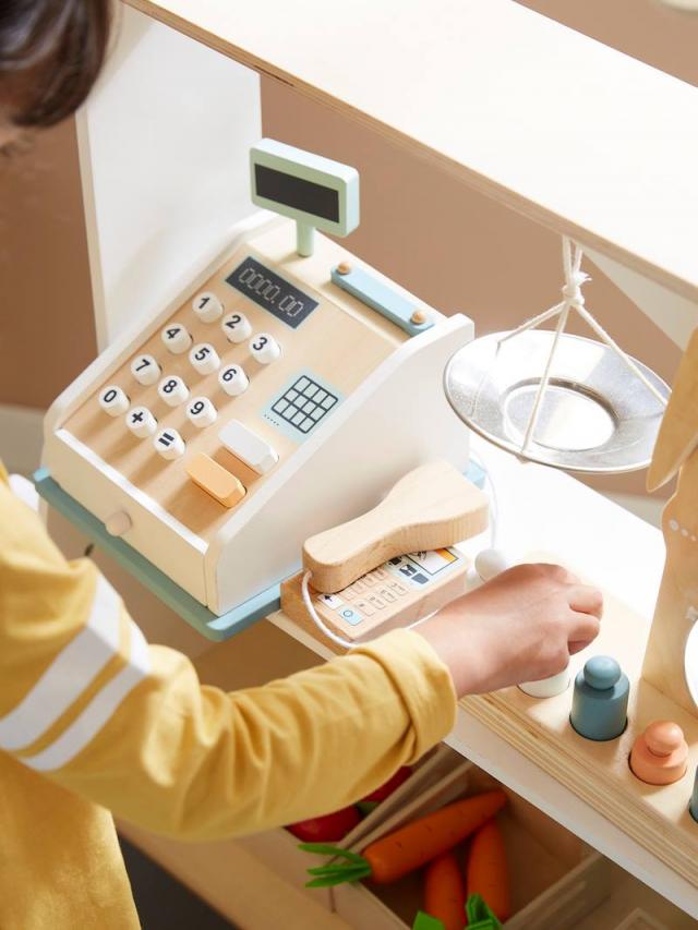 Lo tiene todo, para que los niños imiten a los mayores ¡y aprendan a contar dinero! Incluye: 1 caja registradora, 1 lector CB, monedas, billetes y 1 rollo de papel para los tickets de la caja. Dimensiones: 19 x 15 x 11 cm. INFORMACIÓN ADICIONAL: Desde los 3 años. Para promover el juego de imaginación. Permite expresar sentimientos. Ayuda a aprender a contar. Favorece la imaginación e invita a compartir. Caja registradora y accesorios de madera.