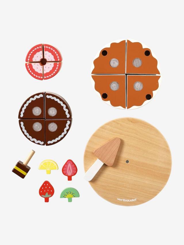 ¡Una increíble tarta de 3 pisos que impresionará a los invitados de tu peque! Es ideal para celebrar los días más especiales, como los cumpleaños. ¡Esta preciosa tarta está compuesta por partes desmontables y frutas para encajar que le proporcionará un efecto aún más especial! Tarta de 3 pisos 4 partes desmontables con tira autoadherente entre pisos Cada piso es de un sabor diferente En el piso 1 hay 4 frutas para encajar (2 fresas + 1 kiwi + 1 limón) En el piso 3 hay 1 pequeño pastel individual de chocolate para encajar 1 pala de tarta con bisel para sujetar con más facilidad los trozos del pastel + 1 plato redondo de madera con patas blancas de madera Dimensiones Altura de cada parte: 4 cm Diámetro del piso 1: 16 cm – Diámetro del piso 2: 12 cm – Diámetro del piso 3: 8 cm – Diámetro del plato: 20 cmAltura total de la tarta + plato + pequeña tarta para encajar: 18 cmGrosor de las frutas: 1 cm – Pala de tarta: 12 cm de largo INFORMACIÓN ADICIONAL: A partir de 2 años Promueve los juegos de imitación y permite que aprendan a compartir Estimula la imaginación y la creatividad Tarta de madera FSC® de 3 pisos con fruta