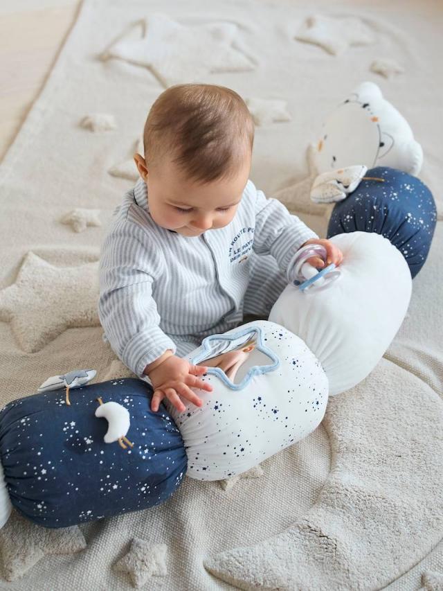 La almohada de actividades Celeste ofrece multitud de posibilidades para divertir a los más pequeños. 1 almohada con forma de cabeza de oso polar + 5 cojines Cabeza de oso polar estampada 1 cojín con estampado de estrellas y campanillas en el interior del que cuelga un zorro enganchado a una cinta 1 cojín con 2 estrellas aplicadas + 2 aros de plástico + 1 aro transparente de bolas 1 cojín estampado con un espejo en forma de estrella 1 cojín con estampado de estrellas y una luna + una estrella fugaz colgantes 1 cojín con una luna menguante bordada con hilo dorado + 3 cintas Dimensiones: Almohada de oso polar: Largo 25 x Ancho 18 cm 1 cojín: 21 x 13 cm Largo total: 120 cm INFORMACIÓN ADICIONAL: Desde el nacimiento Estimula el desarrollo sensorial Promueve el desarrollo de la motricidad fina Una bonita idea para regalo Almohada de actividades CELESTE de algodón con relleno de poliéster.